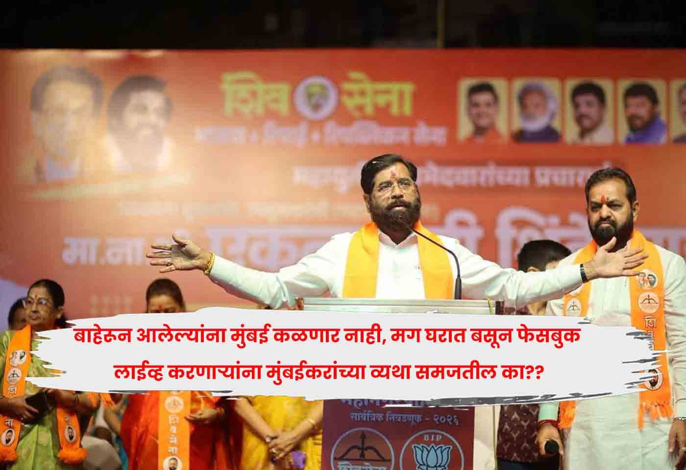 बाहेरून आलेल्यांना मुंबई कळणार नाही अशी ओरड काहीजण करत आहेत, मात्र घरात बसून किंवा फेसबुक लाईव्हच्या माध्यमातून मुंबई आणि मुंबईकरांच्या व्यथा कधीच समजणार नाहीत, असा टोला एकनाथ शिंदे यांनी हाणला.