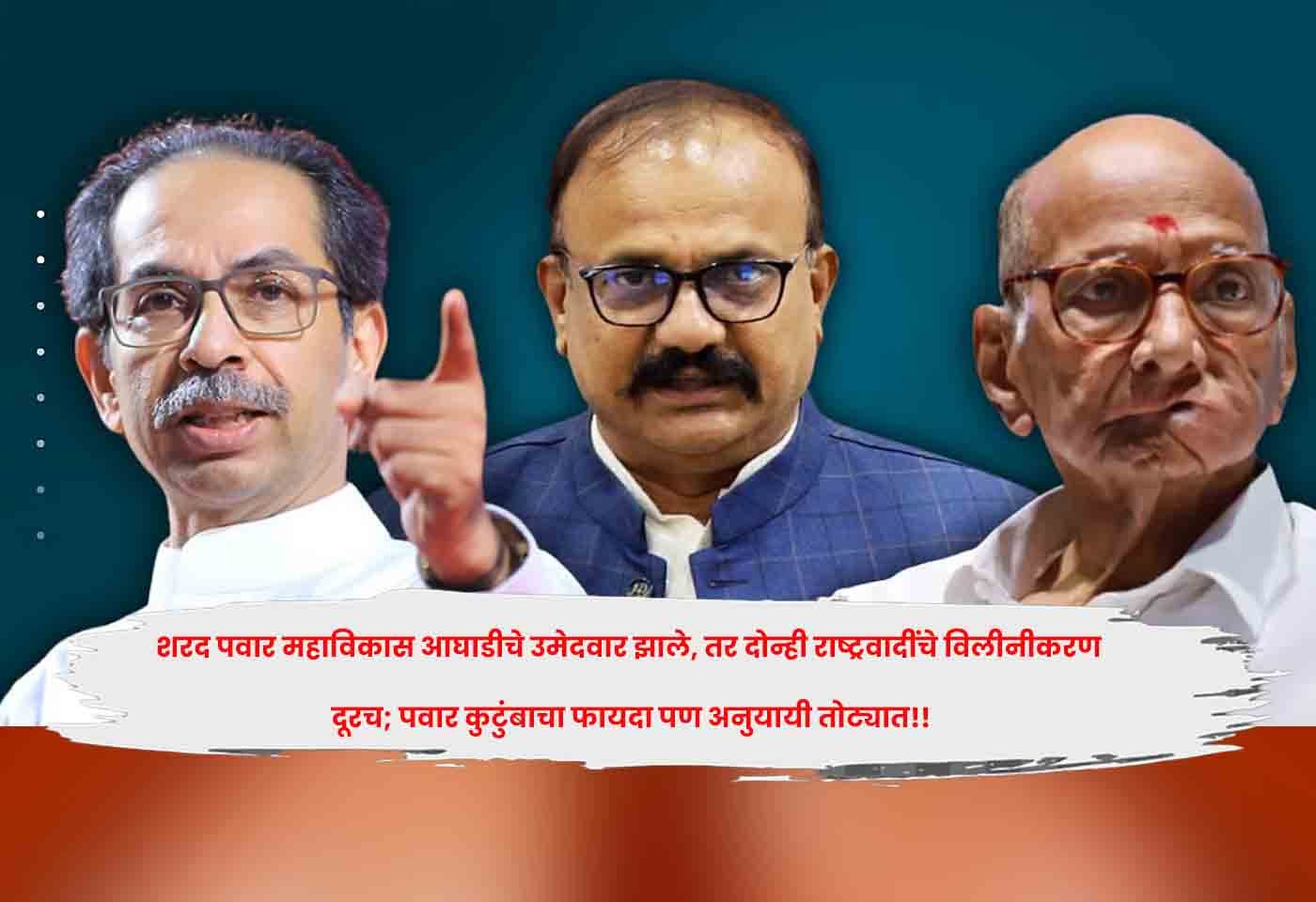 नाशिक : राज्यसभा निवडणुकीसाठी शरद पवार जर महाविकास आघाडीचे एकमेव उमेदवार झाले तर दोन्ही राष्ट्रवादींचे विलीनीकरण आणखी दूर जाईल. यातल्या राजकारणात पवार कुटुंबाचा फायदा जरूर होईल, पण त्यांचे अनुयायी मात्र तोट्यात जातील.