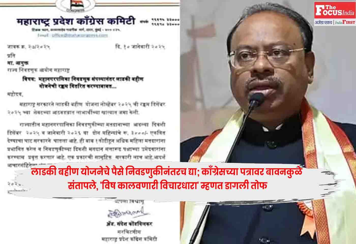महानगरपालिका निवडणुकीच्या मतदानाच्या अगदी आदल्या दिवशी १ कोटीहून अधिक महिला मतदारांच्या खात्यात ३ हजार रुपये जमा करणे, हा मतदारांना प्रभावित करण्याचा जाणीवपूर्वक प्रयत्न असल्याचा दावा काँग्रेसने केला आहे. ही कृती म्हणजे एक प्रकारची ‘सामूहिक सरकारी लाच’ असून यामुळे आदर्श आचारसंहितेचा भंग होत असल्याचे काँग्रेसने निवडणूक आयोगाला पाठवलेल्या पत्रात म्हटले आहे. आमचा या योजनेला विरोध नाही, मात्र निवडणुकीच्या निष्पक्षतेसाठी हे पैसे मतदानानंतरच दिले जावेत, अशी भूमिका काँग्रेसने मांडली आहे.Chandrashekhar Bawankule