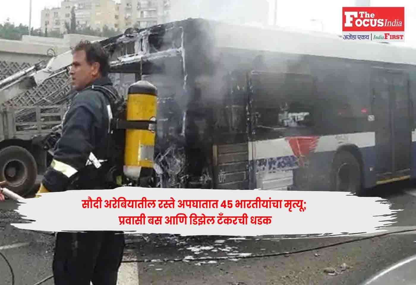 सोमवारी रात्री उशिरा सौदी अरेबियात झालेल्या एका रस्ते अपघातात 45 भारतीयांचा मृत्यू झाला. मक्काहून मदीनाला जाणाऱ्या त्यांच्या बसची डिझेल टँकरशी टक्कर झाली आणि त्यात आग लागली. मृतांमध्ये १८ महिला, १७ पुरुष आणि १० मुले यांचा समावेश आहे. वृत्तानुसार, या अपघातात फक्त बस चालक बचावला.