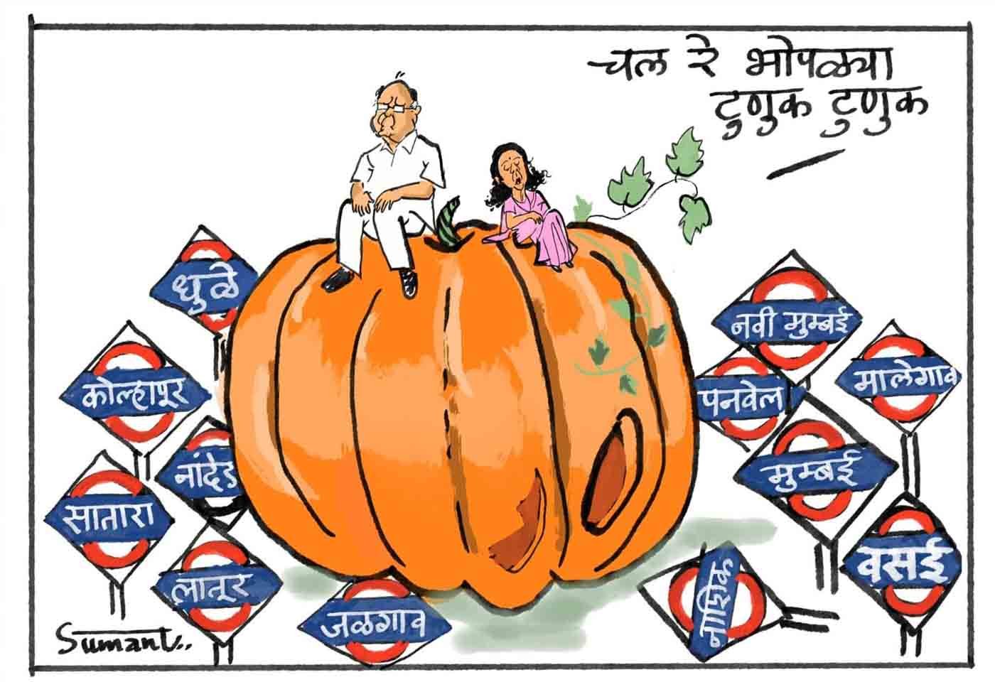 एनडीटीव्ही मराठी नाही दिलेल्या आकडेवारीनुसार महाराष्ट्रातल्या 29 महापालिकांपैकी तब्बल 2869 नगरसेवकांपैकी शरद पवारांच्या राष्ट्रवादी काँग्रेसचे तुतारी चिन्हावर फक्त 29 नगरसेवक निवडून आले. 29 पैकी जवळपास 22 महापालिकांमध्ये शरद पवारांच्या राष्ट्रवादीला 0 भोपळा सुद्धा फोडता आला नाही. म्हणूनच व्यंगचित्रकारांनी त्यांना भोपळ्यावर बसवून चल रे भोपळ्या टुणुक टुणुक म्हणायला लावले!!
