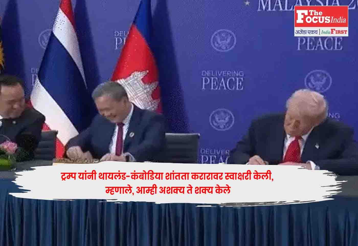 क्वालालंपूर : Trump थायलंड आणि कंबोडियाने रविवारी क्वालालंपूर येथे त्यांच्यातील लष्करी संघर्ष संपवण्यासाठी शांतता करारावर स्वाक्षरी केली. अमेरिकेचे अध्यक्ष डोनाल्ड ट्रम्प यांनी या करारात मध्यस्थी केली.Trump